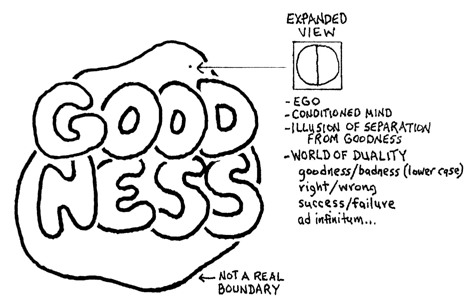 Believing ego’s imaginary world is the real world, we completely lose sight of GOODNESS. GOODNESS becomes goodness, the opposite of badness or wrongness in the illusory, conditioned world of ego.